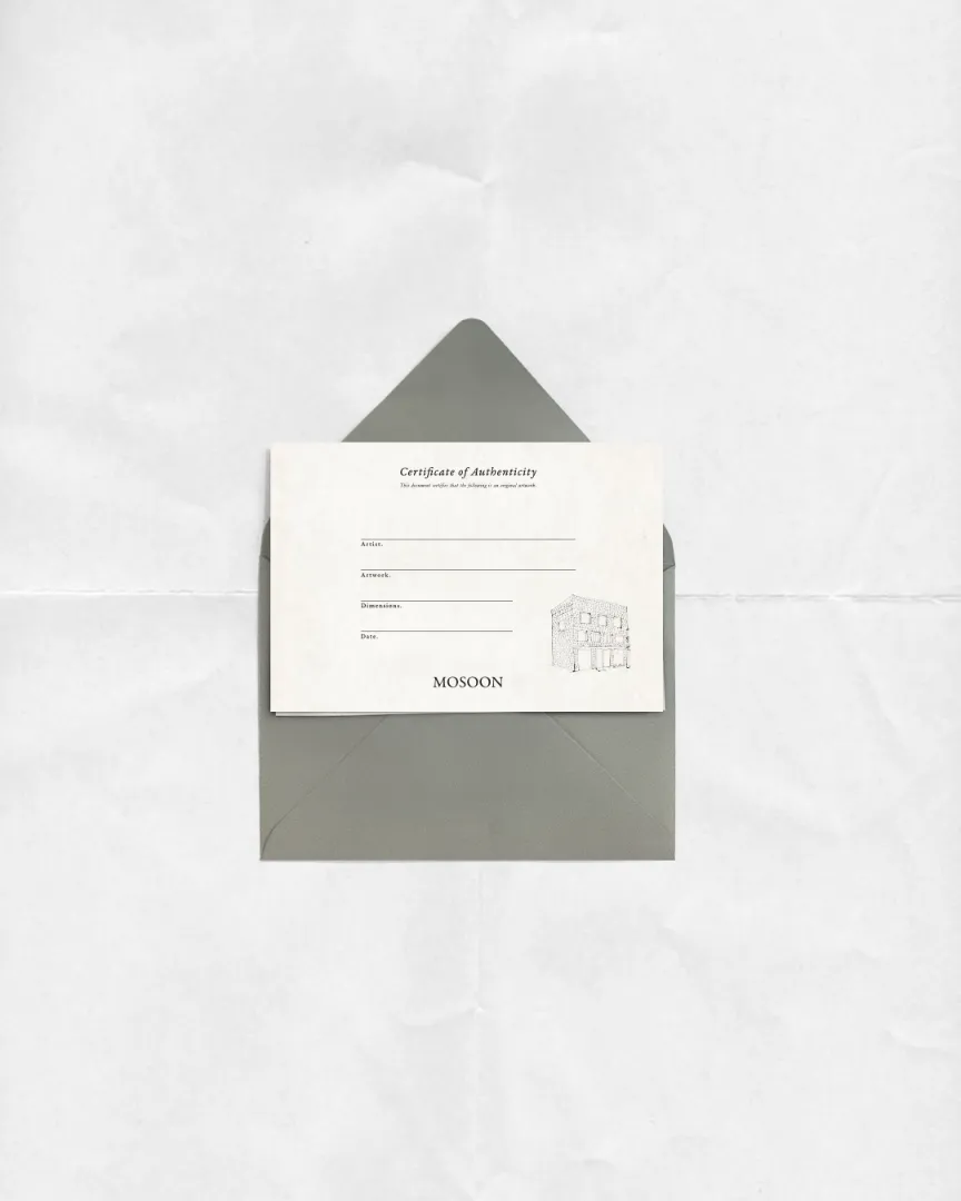 갤러리 모순 Gallery MOSOON, Illustration & warranty card 광화문에 위치한 갤러리 모순을 위한 작품 보증서 카드와 일러스트레이션을 디자인했습니다. 브랜드 톤을 유지하는 그레이 컬러의 봉투와 질감이 느껴지는 지류로 갤러리가 지닌 분위기를 담았습니다.